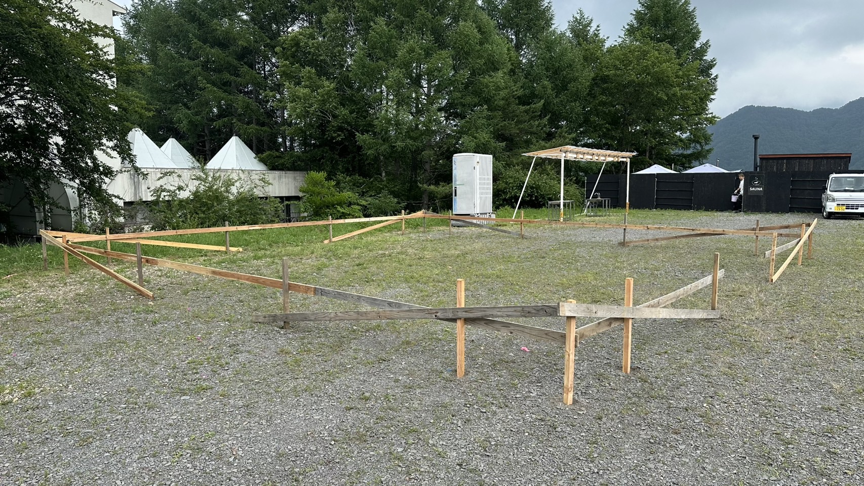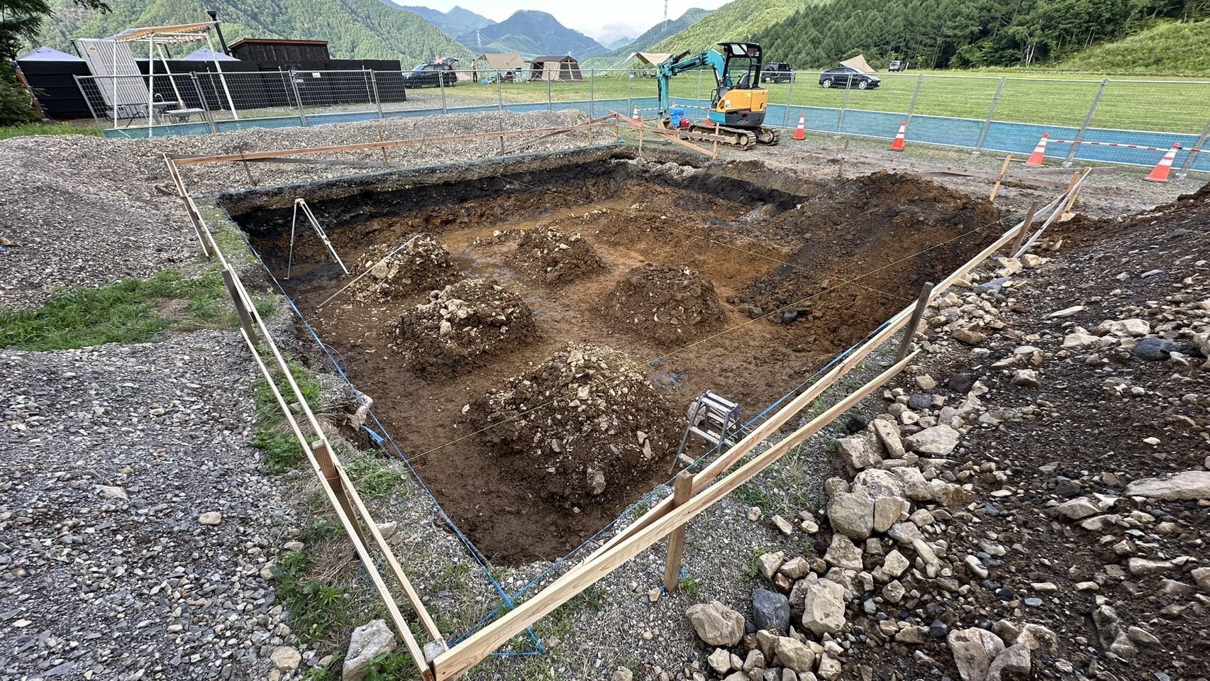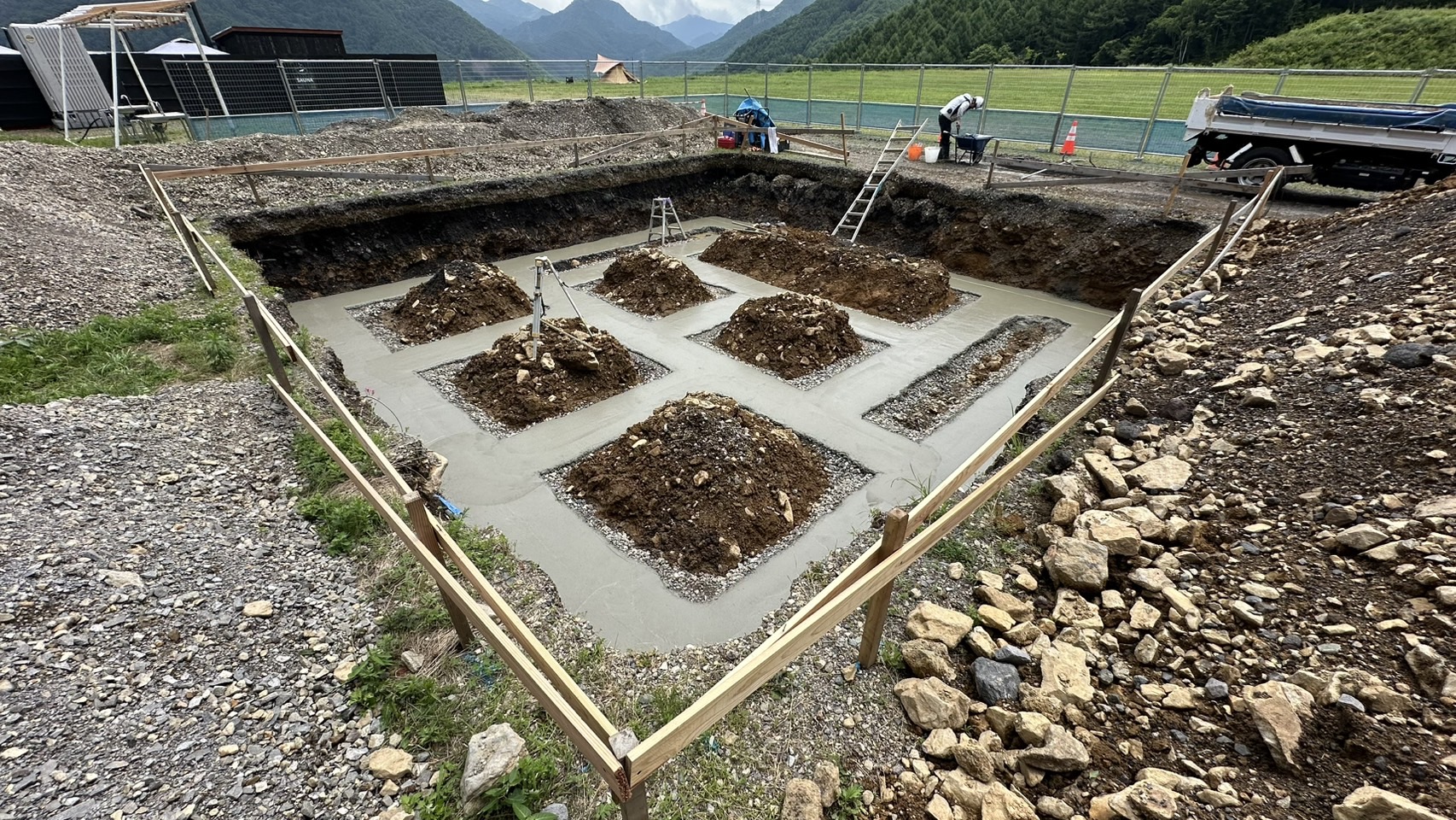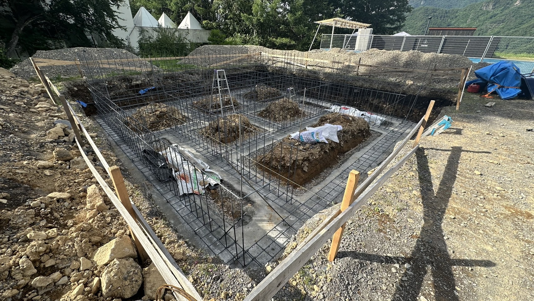 詳細:キャンプ場内のサニタリー棟の基礎工事を行いました。サニタリー棟はトイレやシャワー等の水回りの設備が集中する施設です。