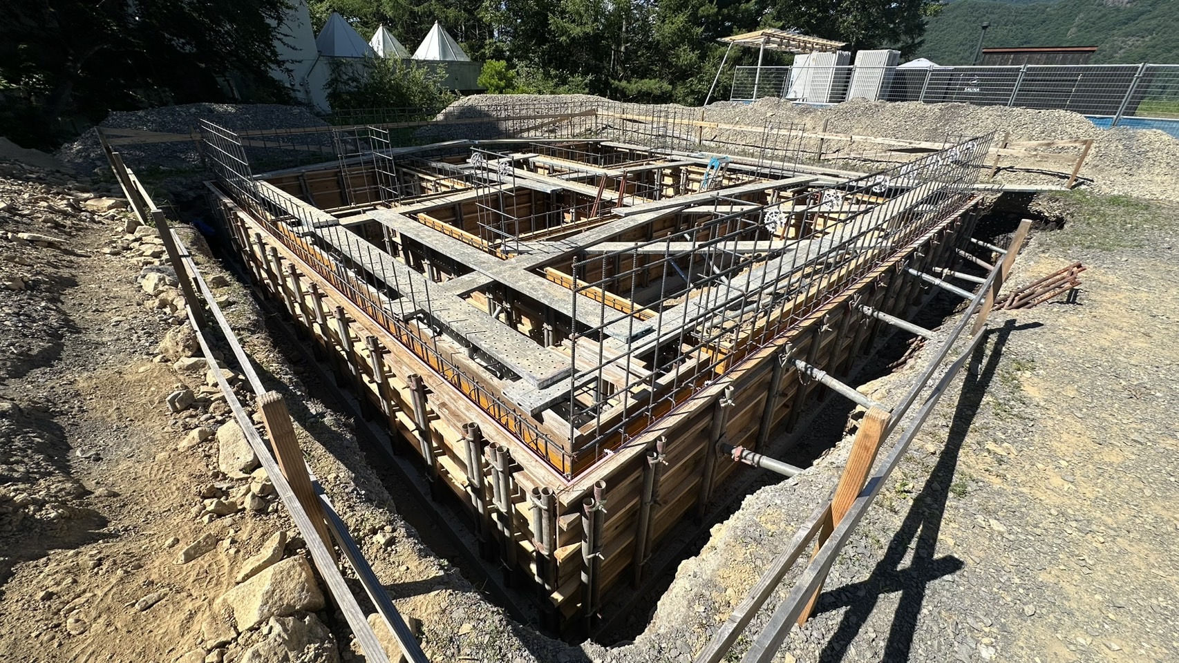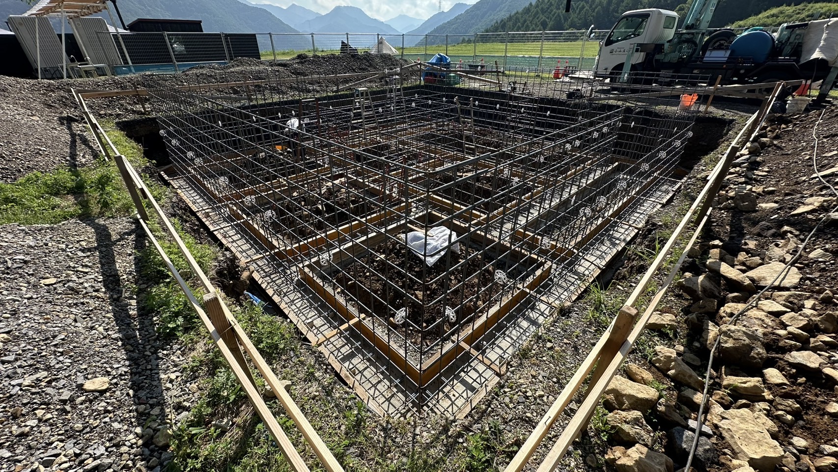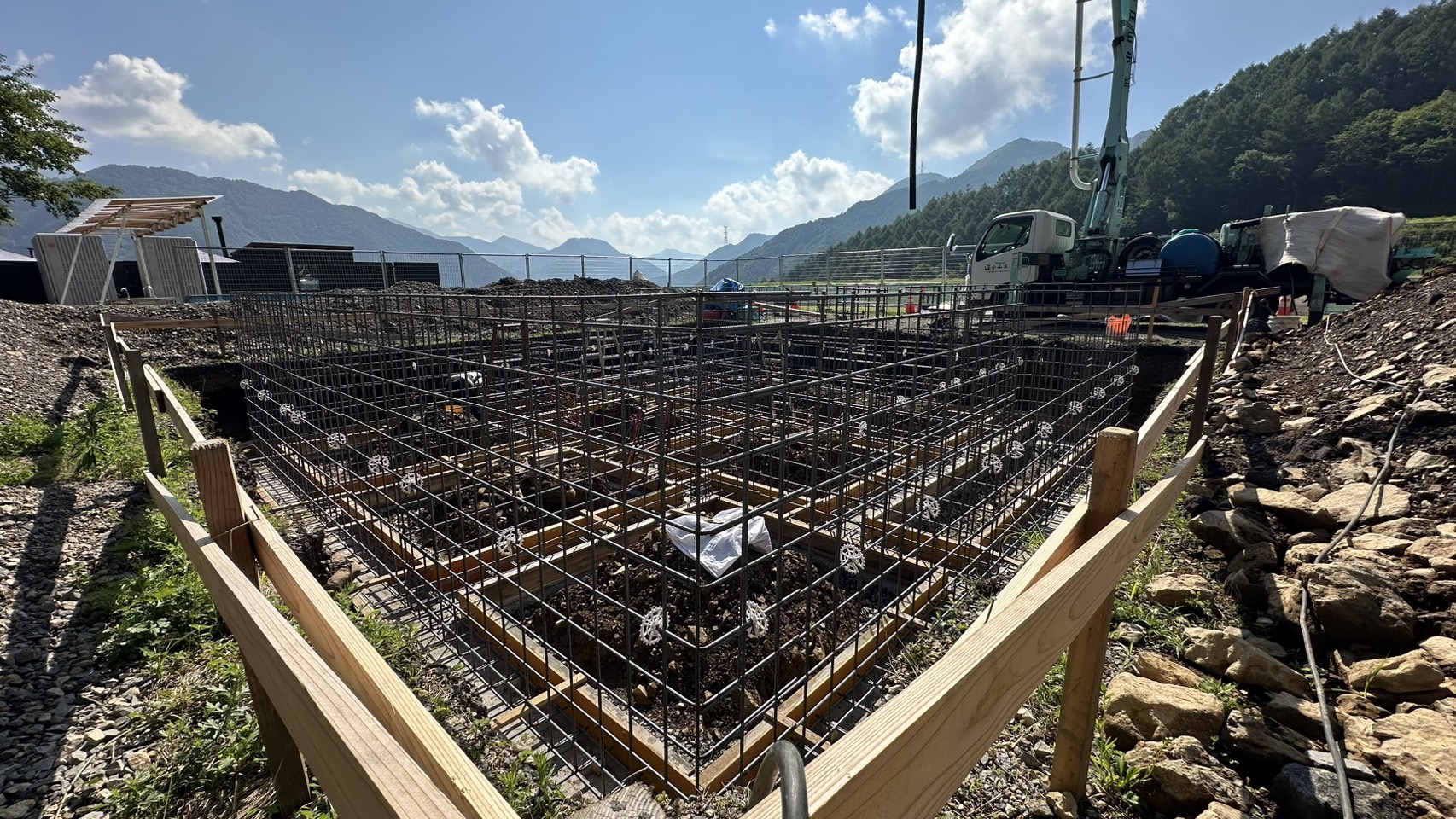詳細:キャンプ場内のサニタリー棟の基礎工事を行いました。サニタリー棟はトイレやシャワー等の水回りの設備が集中する施設です。
