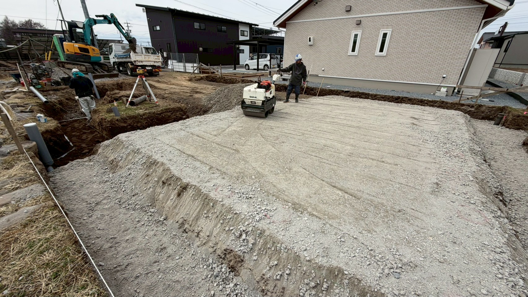 砕石を敷き、しっかりと転圧することで地盤の支持力が増し、建物の重みで地面が不均等に沈む「不同沈下」を防ぐ役割を果たします。